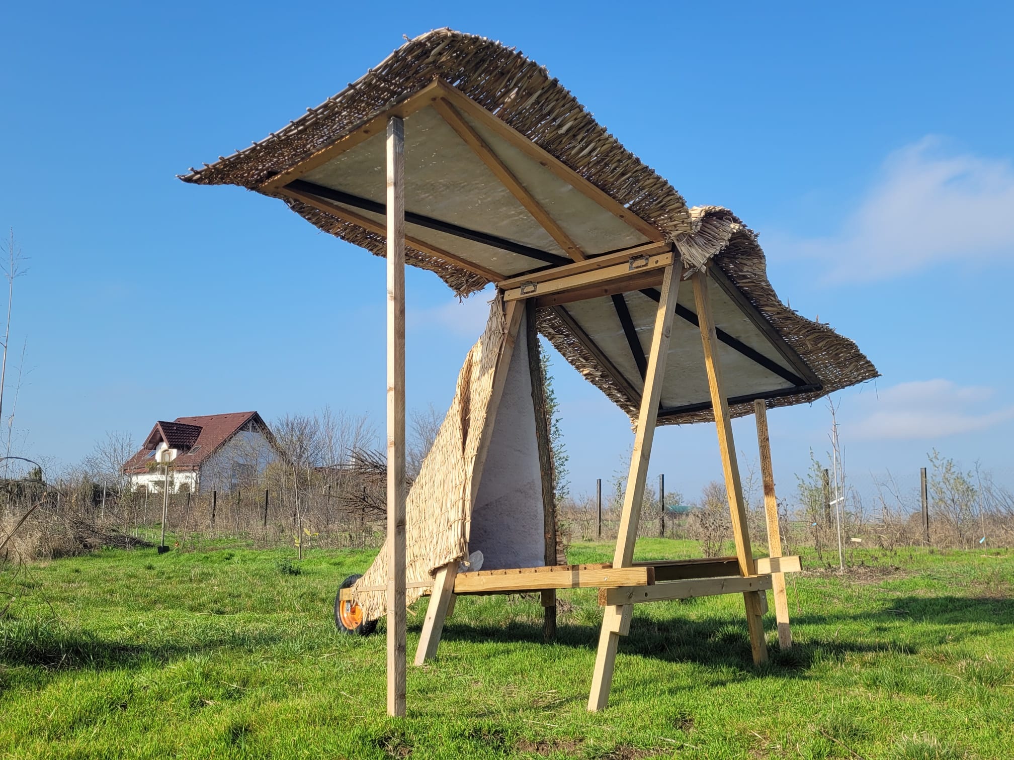 This shelter is the fourth in a series of utilitarian objects/interventions, realised through practical workshops in collaboration with locals, colleagues or children. The first was built together with a group of teenagers, in a forest close to the local Forest Range, using branches from the site and left to be used by the foresters. The second was in Bechet, an area on the desertification map in southern Romania, where sheltering from the sun gave its main purpose. I realised the third in Indonesia, together with a local artist and farmer, from bamboo, a replenishing material there. The idea of a shelter for rest during the hours when heat was too pressing, as well as the mobility allowed by the use of light materials made it possible for the local who contributed to the construction of the structure, and to whom it was donated at the end of the exhibition, to still use it to this day. All these previous experiences added motivations and structural elements to Shelter 4.0, which in Siliștea Snagovului was thought through after intense experiences of work in the field in the summer, where shade is one of the most desired elements. The construction here is multifunctional, offering a place for one person to take a nap, shade for 5-6 people, a possible mobile office space or other uses depending on the necessities of the community at the Station and around.
