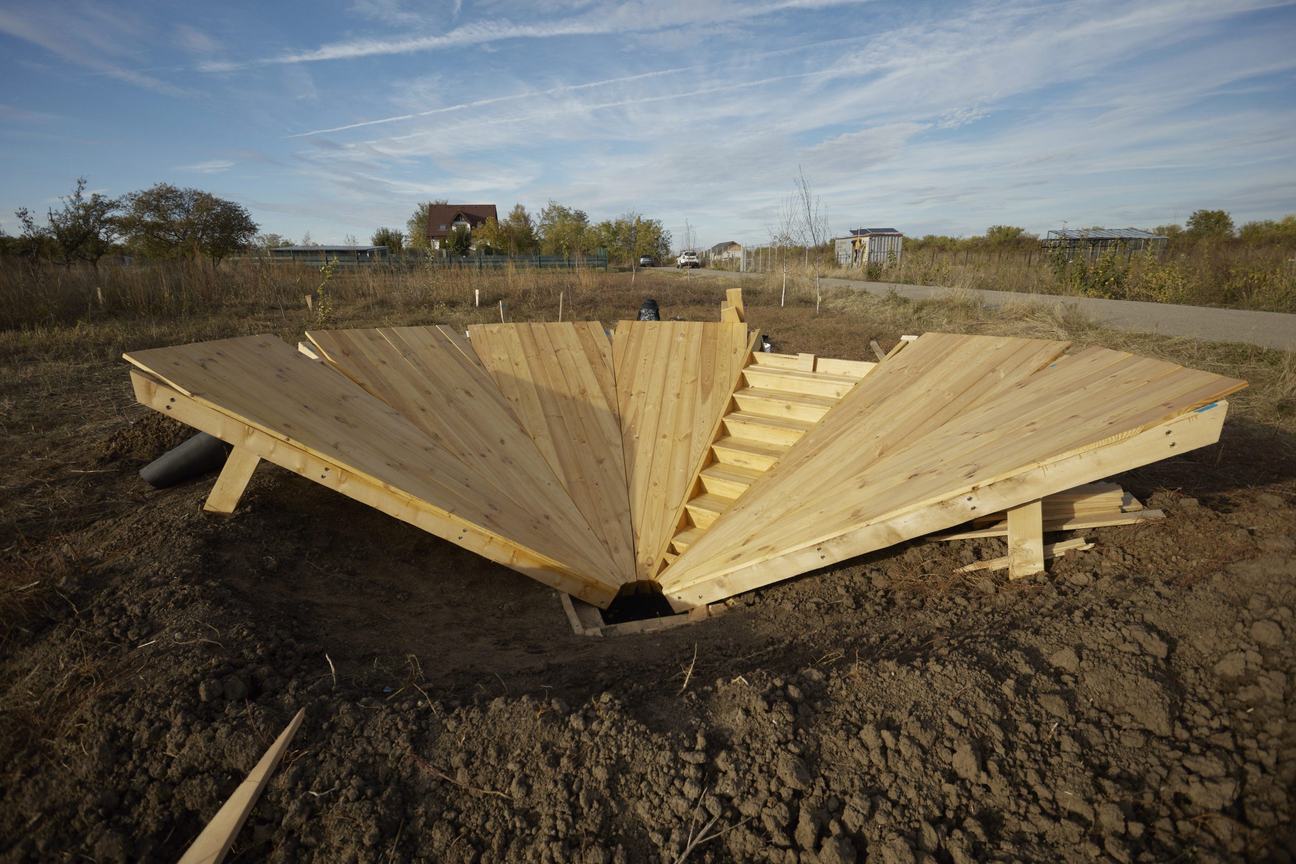 The Rain Collector is a wooden architectural installation inspired by the shape of the whirlpool (Vâltoare)– a traditional mechanism used to wash fabrics in the rapid mountain waters. It is conceived as a space open to the public, where the whirlpool becomes a catalyst for meetings, ideas and artistic experiences. The semi-buried structure transforms into an amphitheater that can host performances, discussion sessions, sound auditions or community meetings. At the same time, the installation also has a concrete ecological dimension – its shape channels rainwater, collecting it in a central catchment basin mounted below stage level. The swirling movement of the water in the whirlpool is thus transferred into a flow of ideas, sensations and experiences.