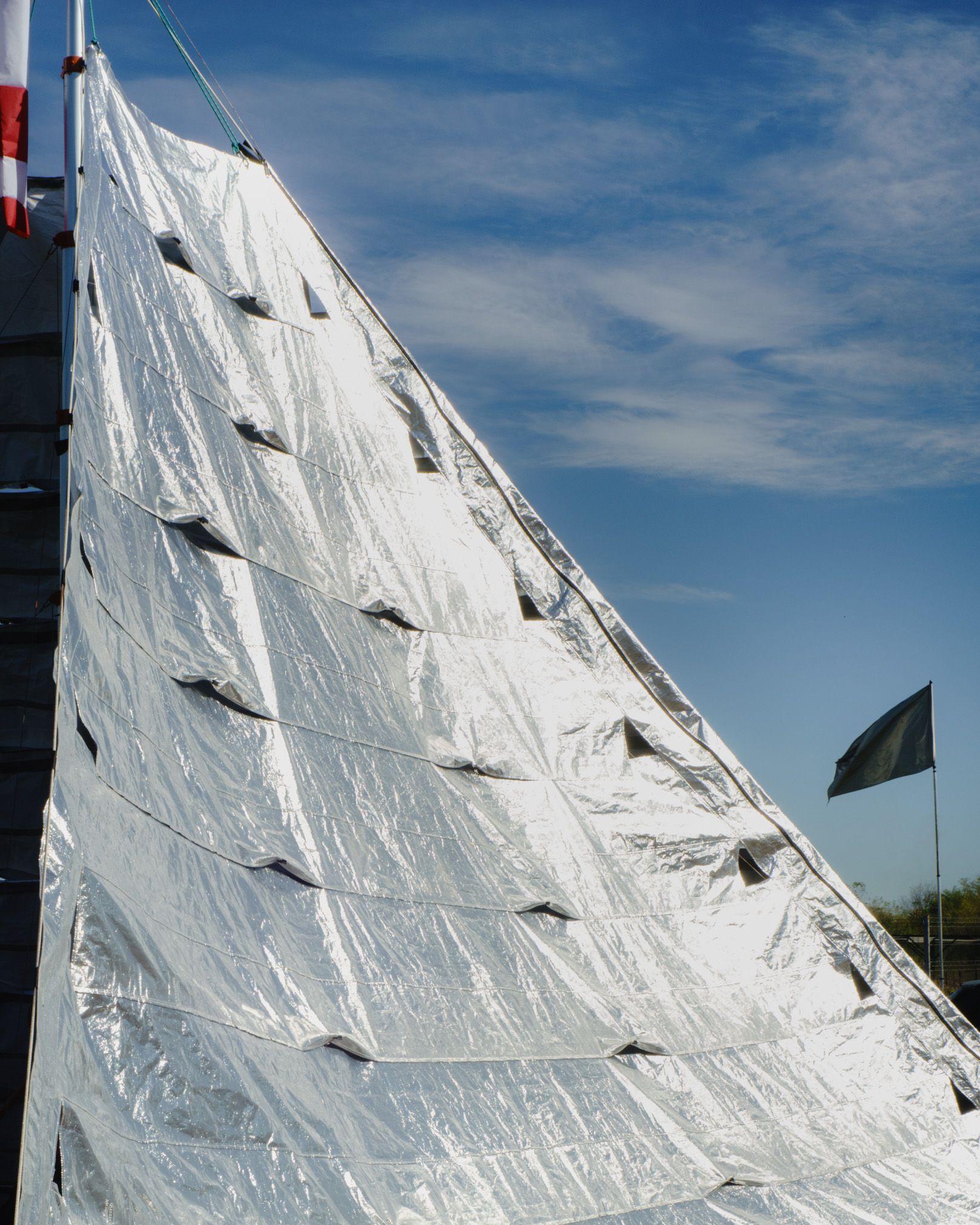 The device functions as a mobile unit, temporarily positioned in an open field, creating space for multiple scenarios of learning and exchange. The telescopic structure supports a specular textile membrane — a material used in both agriculture and space research — capable of reflecting sunlight and creating shade.