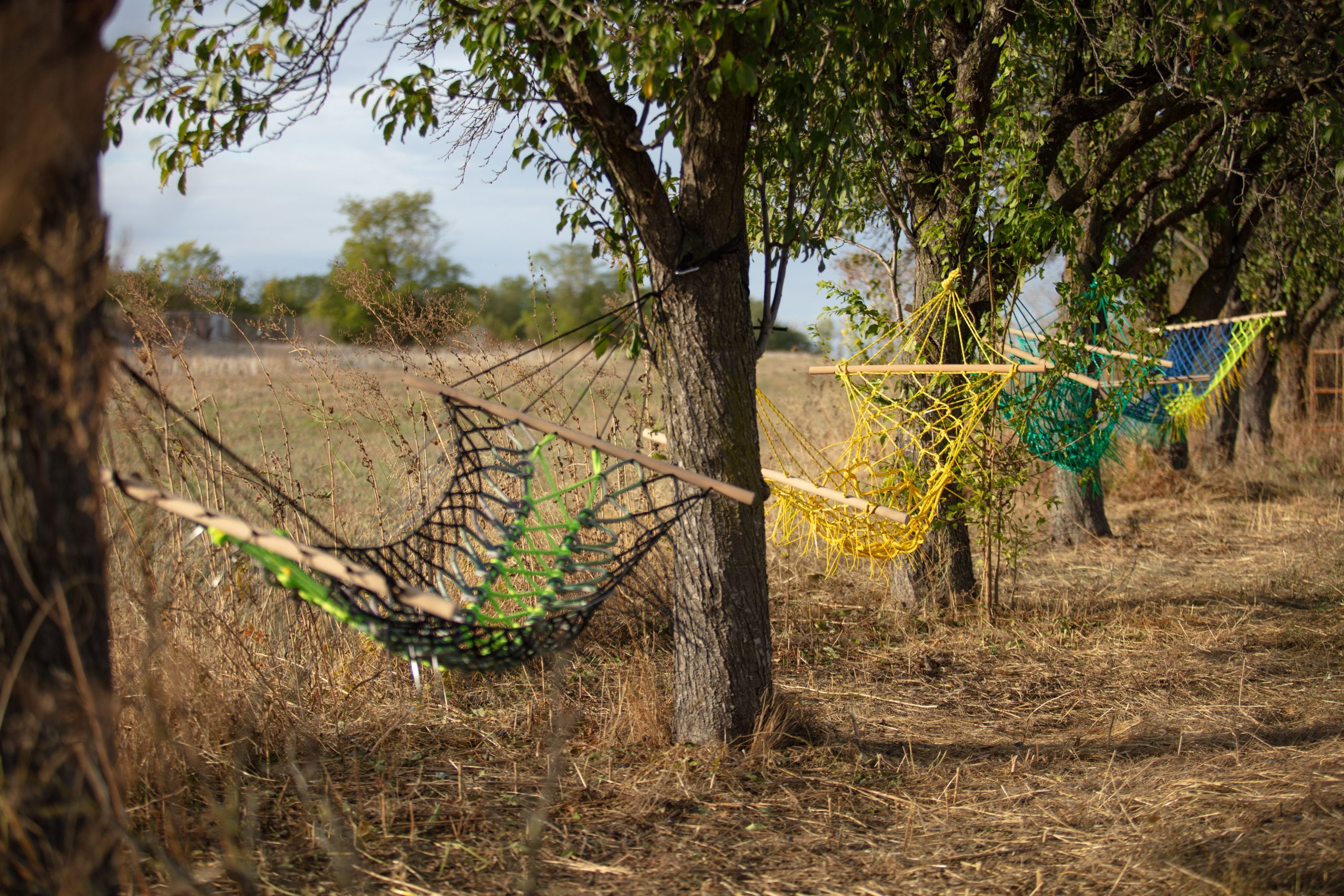 In the context of the project „Shelter for collective dreaming”, near Bucharest, I created an installation made of a few uncoventional hammocks made from textile fibers. Each piece is unique, intensely coloured and scattered with „thorns”, suggesting organic shapes inspired by resilient plants such as the thistle or the cactus – plants that know how to survive where shade is missing. The anatomic and vegetal fragments, together with the „thorns” made of plastic bands, inspired from this arid landscape, tell the tale of exposed bodies and need for protection, of a temporary yet necessary refuge. The hammocks, as in other of my previous works, are symbols of pause and recovery: suspended lace from industrial ropes, fragile but resistent spaces, places in which the body and the mind reconquer their time. Within this „shelter”, they transform into structures for meditation and survival, an oasis of friendship and community, where colours become a common language and the air is filled with silence.